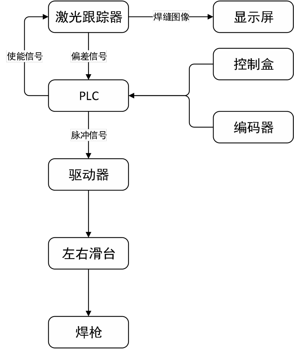 如下圖所示,設備包含跟蹤器,人機界面,微嵌屏,PLC 控制柜,驅動器, 跟蹤滑臺,擺動滑臺,控制盒。激光焊縫跟蹤器通過激光發射與接收,經過內部算法處理得到焊縫圖像與偏差信號。焊縫圖像通過網口傳送給顯示屏,顯示屏顯示圖像。伺服編碼器計算旋轉電機的旋轉脈沖數,轉換成行走距離,發給 PLC 用于實現多層多道。跟蹤器檢測出的正確焊縫位置數據,通過以太網通訊發給 PLC,經過 PLC 運算處理轉化成脈沖信號發送給驅動器,從而調正焊槍位置。