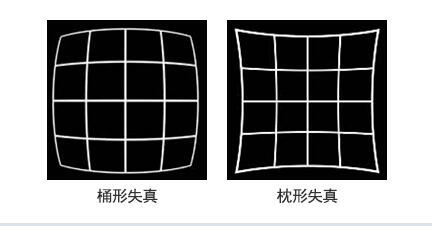 表示通過鏡頭成像的圖像發(fā)生歪曲的狀態(tài)。事實上不存在形狀完美的鏡頭。因此,雖然從理論上來說,直射光通過鏡頭后會沿著直線傳播,而實際上光通過鏡頭后會向外側(cè)或者內(nèi)側(cè)歪曲。前者稱為「桶形失真」,后者稱為「枕形失真」。一個鏡失真的參數(shù)以百分比表示。