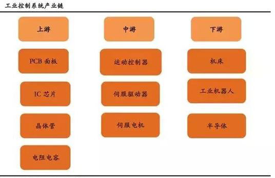 控制系統上游包括各類電子元器件,如PCB面板、IC芯片、晶體管、電阻電容等,中游核心部件包含運動控制器、伺服驅動器、伺服電機等,下游運用于工業機器人、半導體、機床等各行各業。