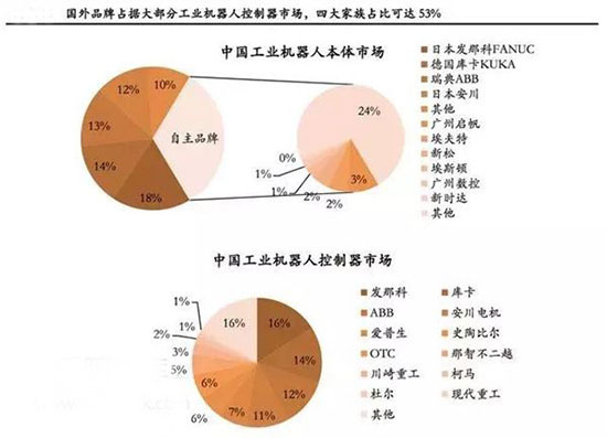 目前國內(nèi)的上游核心零部件廠商以及中游的本體制造商國產(chǎn)化率都較低,市面上80%的市場份額都被外資占據(jù)。