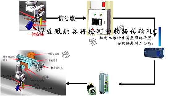焊縫跟蹤器將檢測的數據傳輸PLC,控制二維滑臺調整焊槍位置,實現偏差糾正功能。