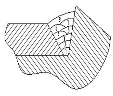 如果焊接焊腳尺寸大于12mm以上的焊件時(shí),可采用三層六道、四層十道來完成, 如下圖所示。焊腳尺寸越大,焊接層數(shù)、道數(shù)就越多。