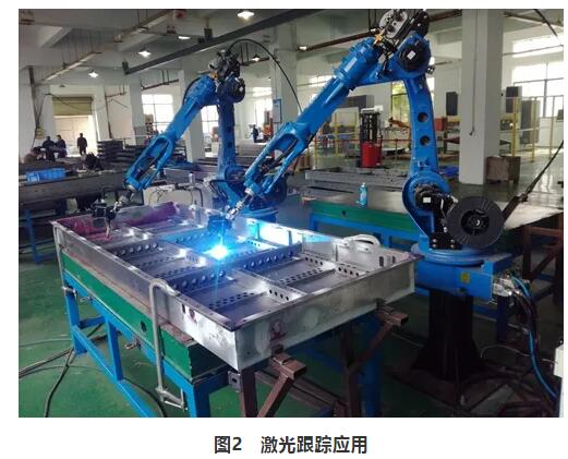 在實際自動焊接過程中,激光焊縫跟蹤器的作用是對焊縫做精確的定位。一個完整的焊縫檢測跟蹤系統通常由激光結構光傳感器、控制器及執行機構組成,它們構成了一個完整的閉環控制系統,實現了檢測、計算和執行的功能。在實際使用中執行機構有可能是由伺服電動機、直線導軌滑臺組成的焊接專機,也可能是焊接機器人。控制器一般為工控機或FPGA、DSP等嵌入式處理器。除此以外,一般還包括焊接電源、工裝夾具及上下料機構等。機器人自動焊接工作站就是一種典型的應用,首先通過視覺傳感器尋位確定工件及焊縫的位置,修正真實焊縫的焊接起始位置,在焊接過程中啟動實時跟蹤,通過實時的控制機器人不斷修正機器人的焊接軌跡,達到準確的自動焊接(見圖2)。目前常用的跟蹤控制方式有無標定的模糊跟蹤、標定實時跟蹤、尋位及跟蹤+尋位方式。無標定的模糊跟蹤不需要精確標定實時檢測焊槍與焊縫的偏差,并實時地做趨勢微調控制。標定實時跟蹤檢測的是焊縫的實際絕對位置,同時控制焊槍運動到焊縫的實際絕對位置。尋位方式指焊接時不實時跟蹤,在焊接前通過兩點或多點尋位確定當前焊縫或工件的位置,提前修改執行機構的運動軌跡,從而實現精確的焊接。跟蹤+尋位方式則是標定實時跟蹤與尋位方式的結合。