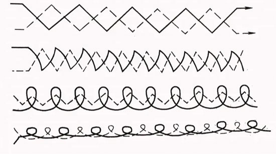 焊槍與焊絲的擺動方法和工件厚度、性質、空間位置及焊縫尺寸有關,常見的擺動方法如下圖