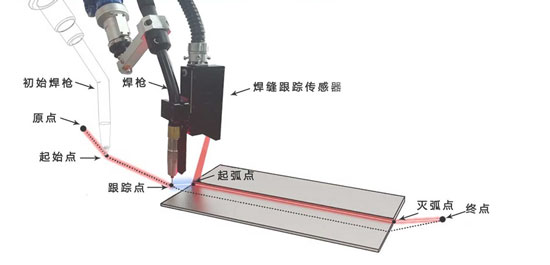 機器人焊縫跟蹤系統(tǒng)無需示教編程,尋位確定工件及焊縫的位置,修正真實焊縫的焊接起始位置,在焊接過程中啟動實時跟蹤,通過實時的控制機器人不斷修正機器人的焊接軌跡,達到準確的自動焊接。